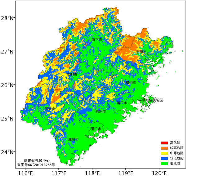 根據(jù)氣象災(zāi)害風(fēng)險評估模型結(jié)果,20日~24日福建出現(xiàn)強冷空氣過程,內(nèi)陸地區(qū)達中等及以上危險等級,其中寧德、三明、南平和龍巖的局部地區(qū)達較高危險等級(圖2)