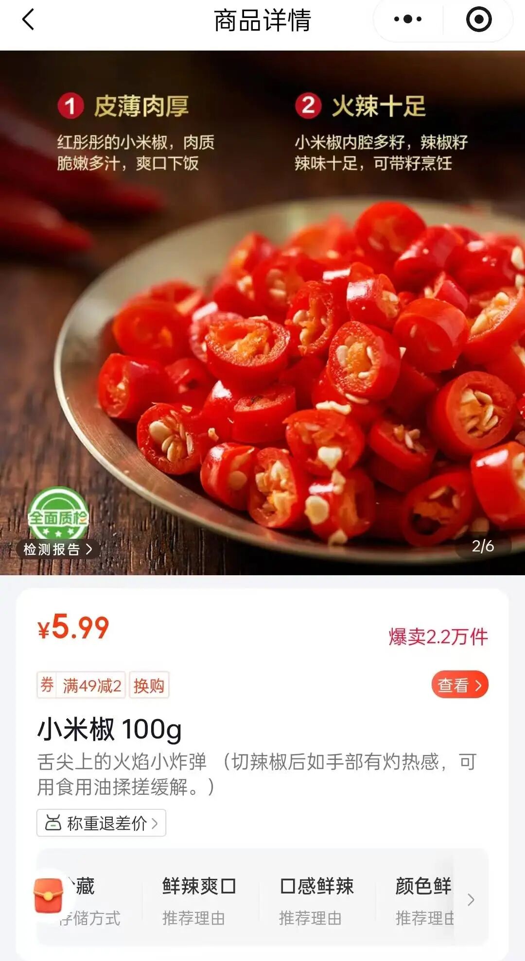 在福州的線上零售平臺(tái),小米椒也在熱銷中。記者在樸樸超市APP及永輝生活小程序上看到,100克裝的小米椒售價(jià)均為5.99元,折算29.95元/斤。