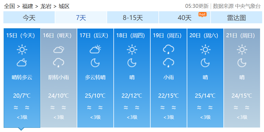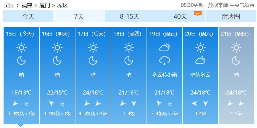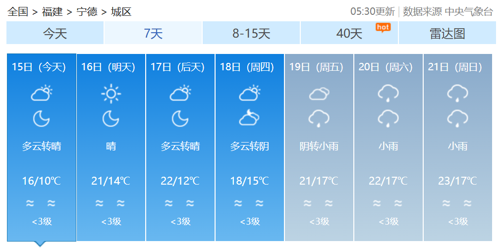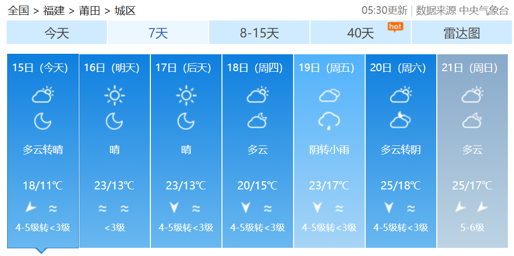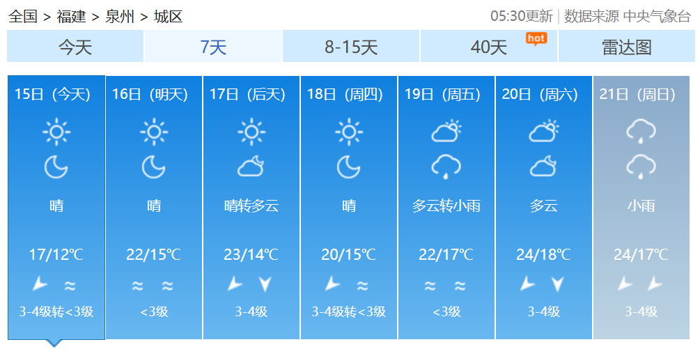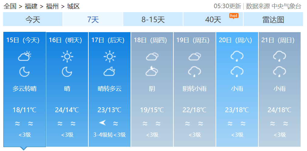 15日白天,氣溫開(kāi)始上揚(yáng),到16日,全省最高溫度都超過(guò)了20°C,體感上白天舒適,早晚寒涼。據(jù)中央氣象臺(tái)消息,福州17日最高溫度達(dá)24℃,溫暖程度堪比常年10月中下旬至11月水平。