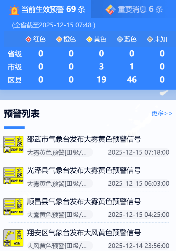 當(dāng)前,福建省內(nèi)生效預(yù)警69條,多地發(fā)布大霧、大風(fēng)黃色預(yù)警信號(hào)和霜凍藍(lán)色預(yù)警信號(hào)。