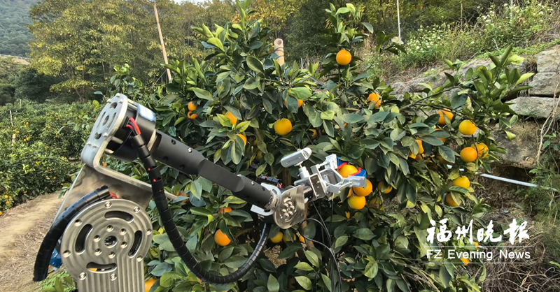 在茂密的果樹間,一臺履帶式機器人穩(wěn)健爬上坡度超過15°的斜坡,用機械臂在雜亂枝葉中精準鎖定目標,柔性指尖輕輕一握,一顆完好無損的柑橘便被收入筐中。這不是科幻電影的場景,而是福建最新研發(fā)的智能采摘機器人正在作業(yè)。