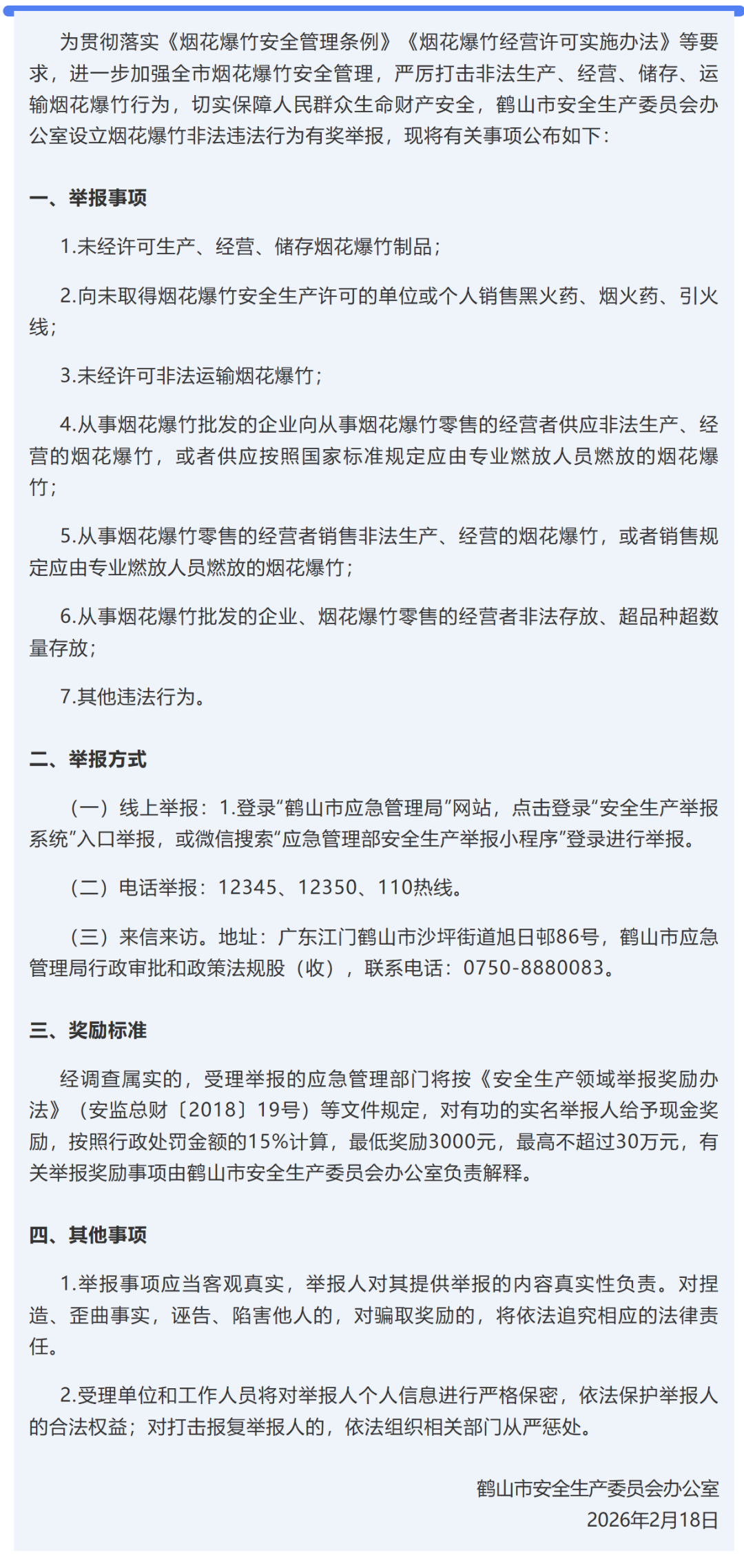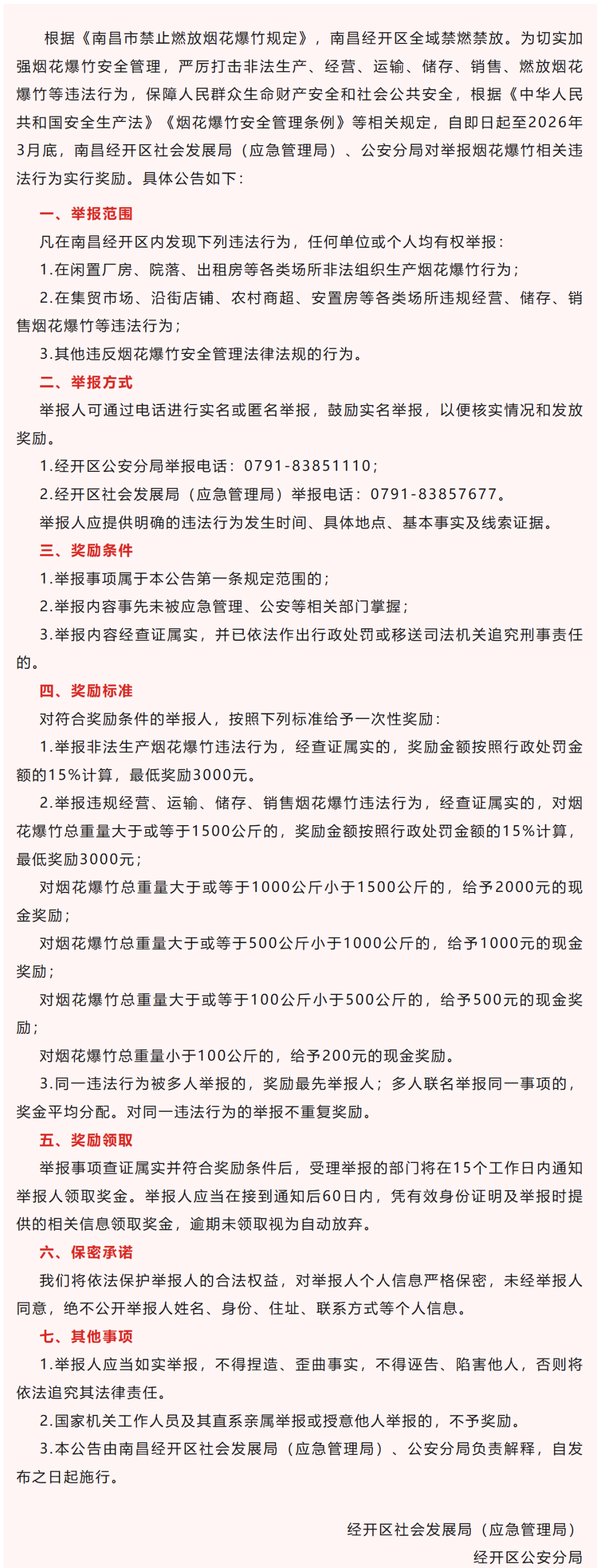 2月19日,漳州高新區(qū)安委會發(fā)布煙花爆竹安全管控舉報獎勵公告,明確了舉報范圍、舉報方式、獎勵標(biāo)準(zhǔn)。