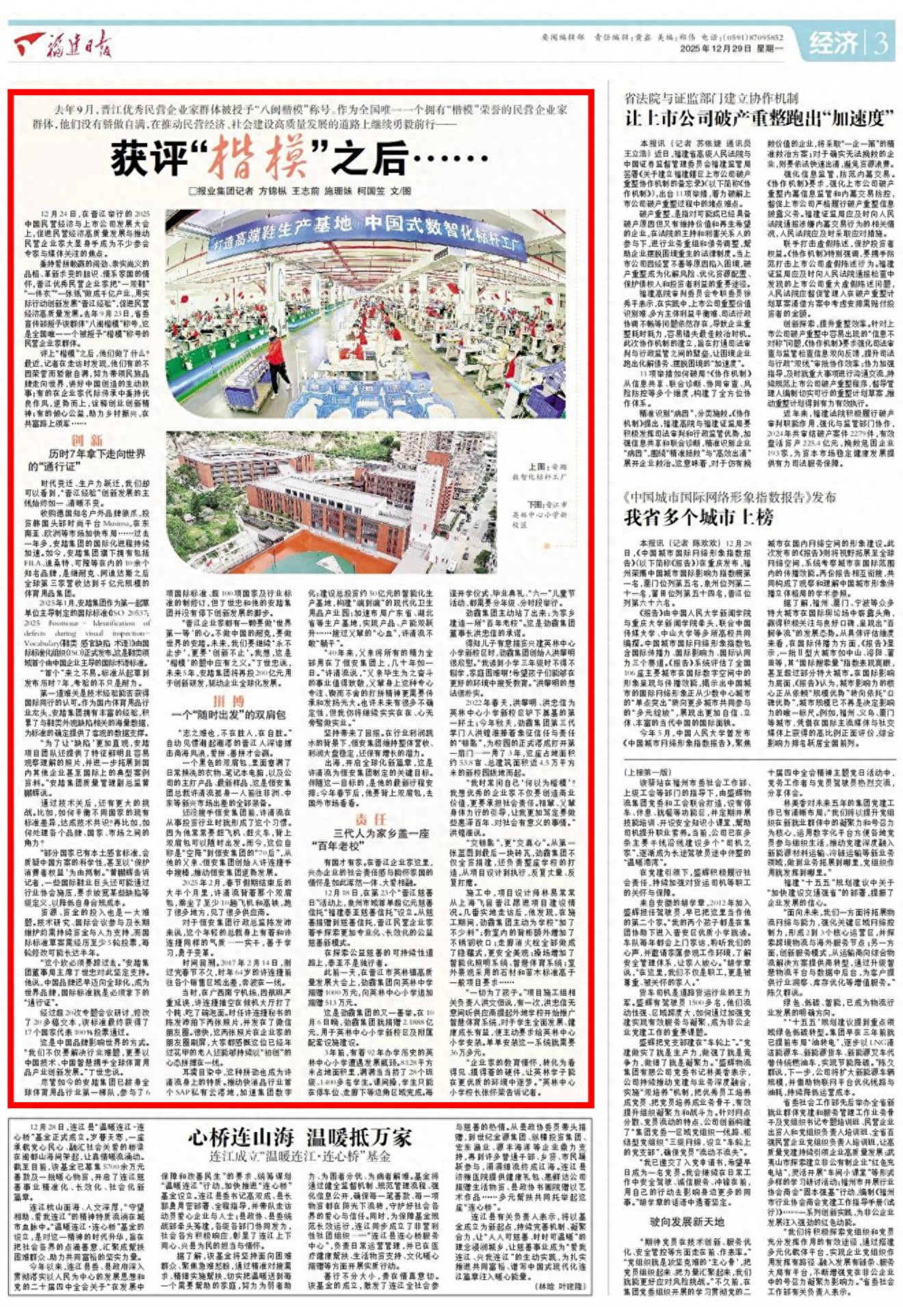 秉持愛拼敢贏的闖勁、崇實尚義的品格、革新求變的膽識、情系家國的情懷,晉江優(yōu)秀民營企業(yè)家把“一雙鞋”“一件衣”“一張紙”做成千億產(chǎn)業(yè),用實際行動創(chuàng)新發(fā)展“晉江經(jīng)驗”,促進民營經(jīng)濟高質(zhì)量發(fā)展。去年9月23日,省委宣傳部授予該群體“八閩楷模”稱號,這是全國唯一一個被授予“楷模”稱號的民營企業(yè)家群體。
