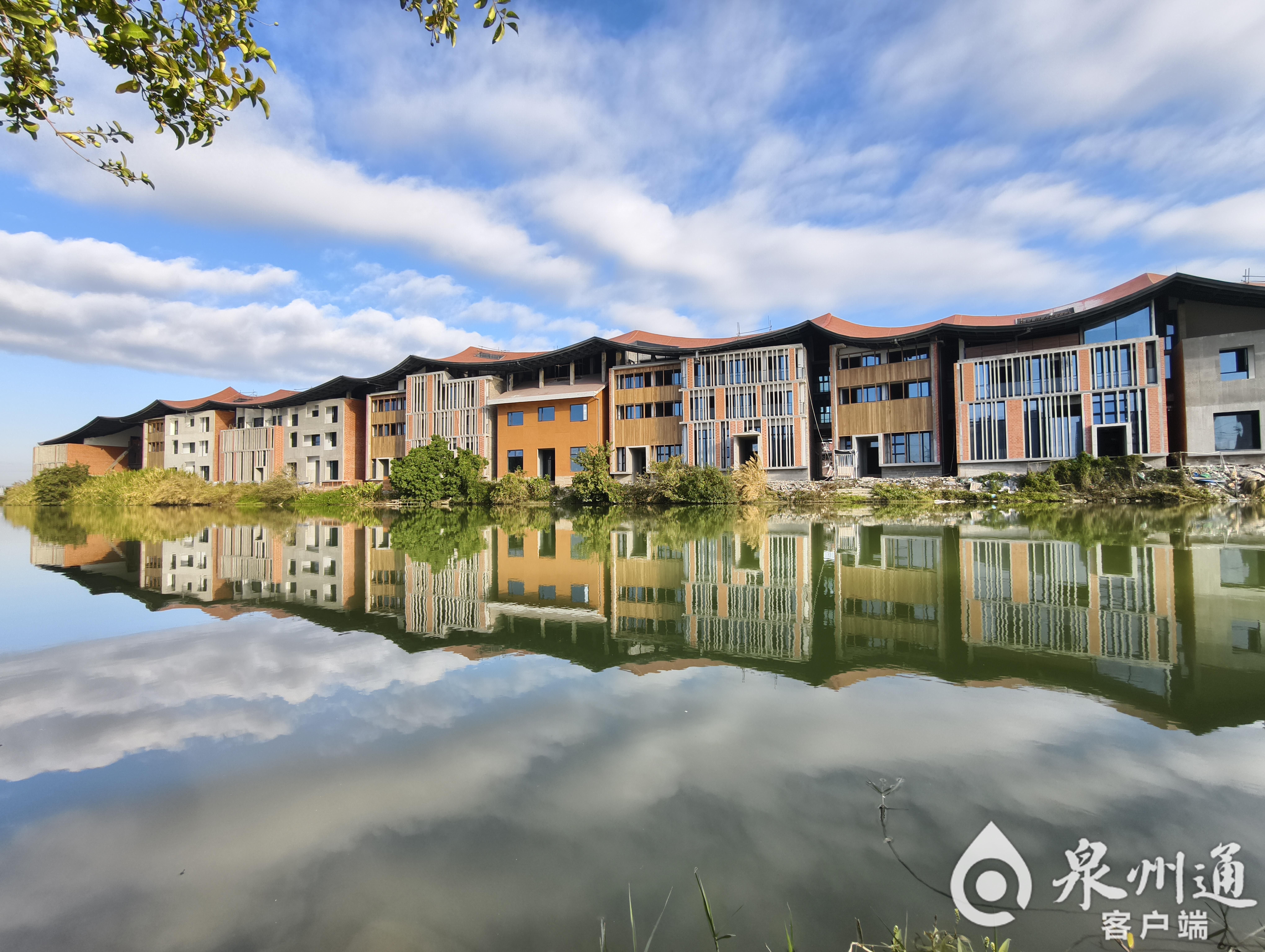 晴日里的晉江九十九溪流域,藍(lán)天白云鋪滿天際,水面如鏡映出岸邊建筑的輪廓,好天氣讓田園景致更顯靈動(dòng)。(王耿華/攝)