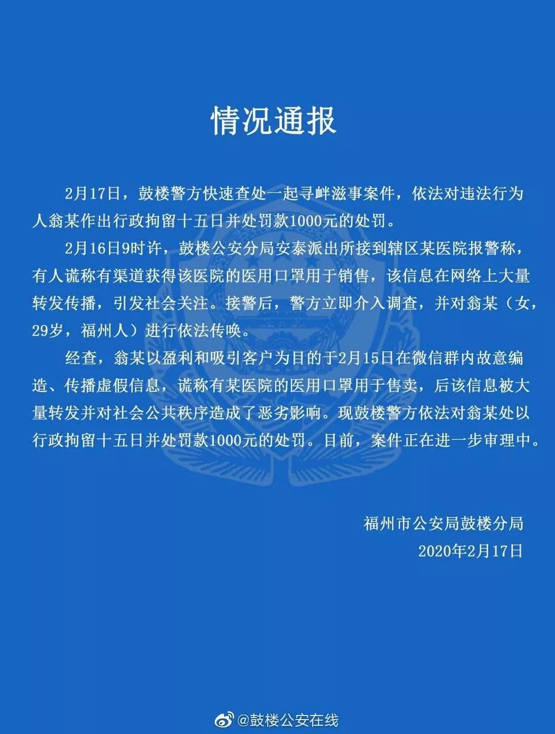 2月16日9時許,鼓樓公安分局安泰派出所接到轄區(qū)某醫(yī)院報警稱,有人謊稱有渠道獲得該醫(yī)院的醫(yī)用口罩用于銷售,該信息在網(wǎng)絡(luò)上大量轉(zhuǎn)發(fā)傳播,引發(fā)社會關(guān)注。接警后,警方立即介入調(diào)查,并對翁某(女,29歲,福州人)進(jìn)行依法傳喚。