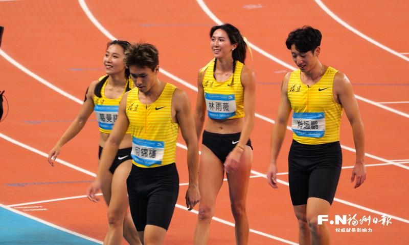福州3名運(yùn)動(dòng)員何錦櫶、林雨薇、肖遠(yuǎn)鵬和隊(duì)友葛曼棋奪得田徑4×100米混合接力冠軍。記者 陳君沂 攝