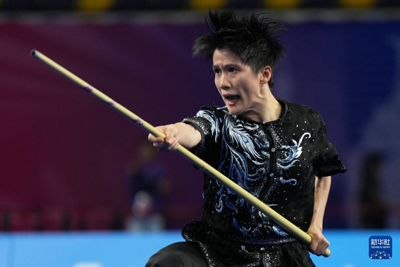 陳惠穎在女子南拳南刀南棍全能項(xiàng)目南棍比賽中。新華社記者 晉美多吉 攝