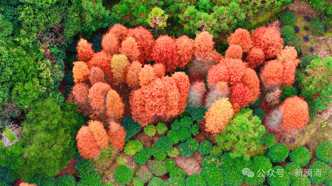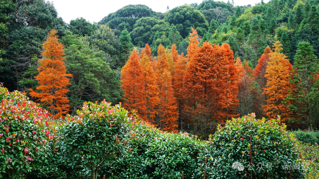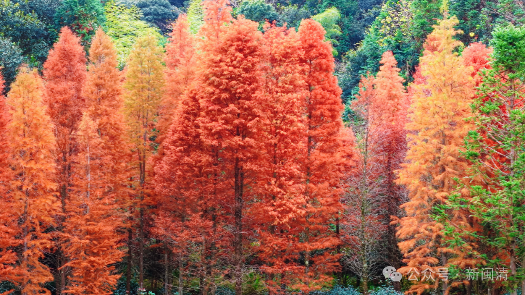 冬日的水杉挺拔林立,紅褐色的葉片交織錯落層層疊疊如燃燒的云霞,在青山環(huán)抱間勾勒出一幅明艷的畫卷。