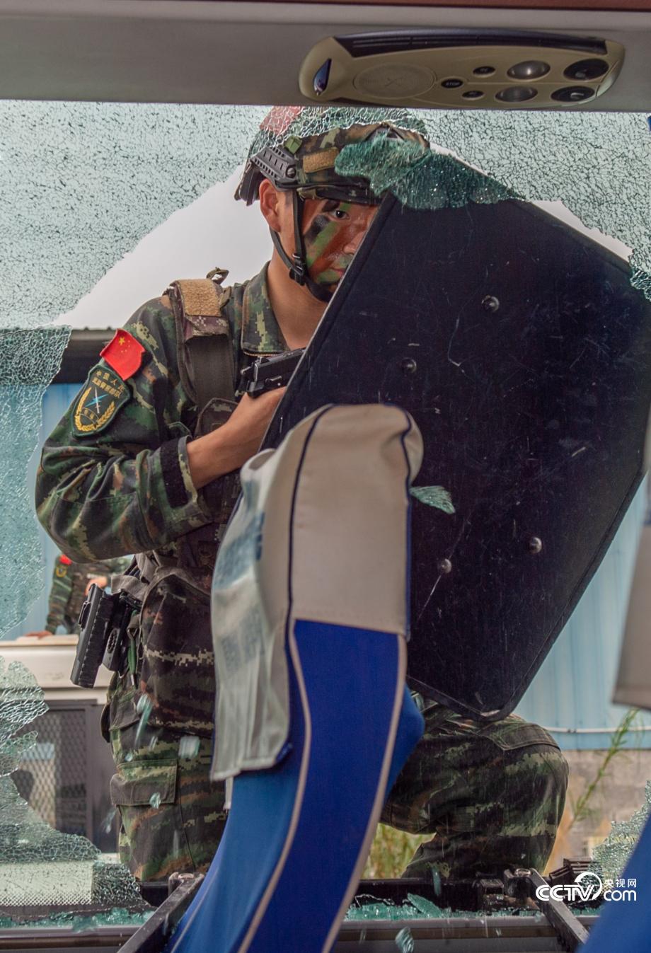 武警特戰(zhàn)隊員快速破窗突擊。