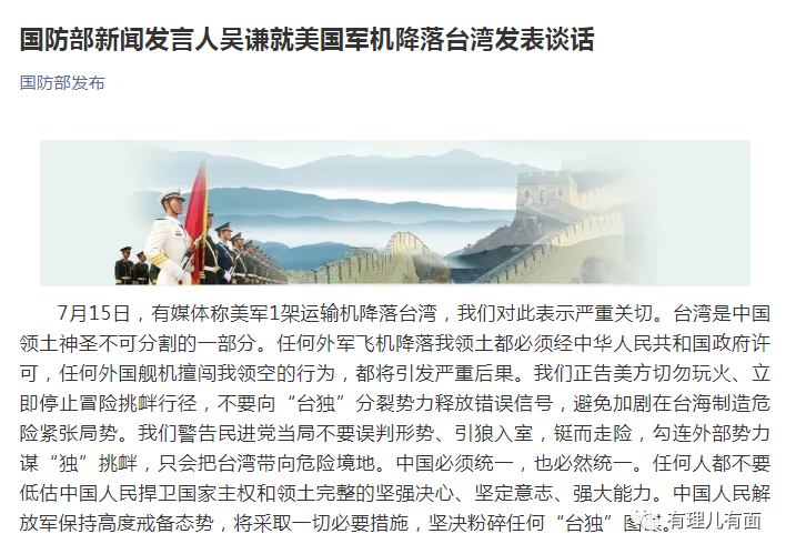 7月15日,國防部發(fā)言人吳謙就美國軍機(jī)降落臺(tái)灣發(fā)表談話,警告任何外國艦機(jī)擅闖我領(lǐng)空的行為,都將引發(fā)嚴(yán)重后果;正告美方切勿玩火,立即停止冒險(xiǎn)挑釁行徑!警告民進(jìn)黨當(dāng)局不要誤判形勢(shì),引狼入室鋌而走險(xiǎn)只會(huì)把臺(tái)灣帶向危險(xiǎn)境地,并表示,中國人民解放軍將采取一切必要措施,堅(jiān)決粉碎任何“臺(tái)獨(dú)”圖謀!