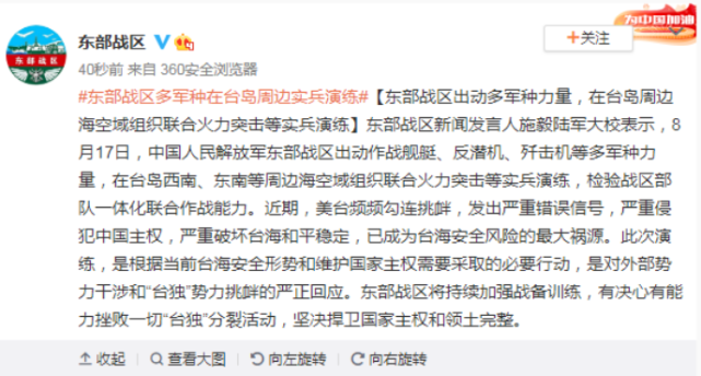 東部戰(zhàn)區(qū)新聞發(fā)言人施毅陸軍大校周二表示,當天,中國人民解放軍東部戰(zhàn)區(qū)出動作戰(zhàn)艦艇、反潛機、殲擊機等多軍種力量,在臺島西南、東南等周邊??沼蚪M織聯(lián)合火力突擊等實兵演練,檢驗戰(zhàn)區(qū)部隊一體化聯(lián)合作戰(zhàn)能力。發(fā)言人還點明,此次演練是對近期美臺頻頻勾連挑釁的一次回應。