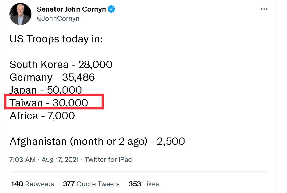 據(jù)臺(tái)灣聯(lián)合新聞網(wǎng)8月18日報(bào)道,美國共和黨參議員約翰·科寧近日在社交媒體上發(fā)文,宣稱美軍在臺(tái)灣地區(qū)駐扎3萬人,引發(fā)各界議論。