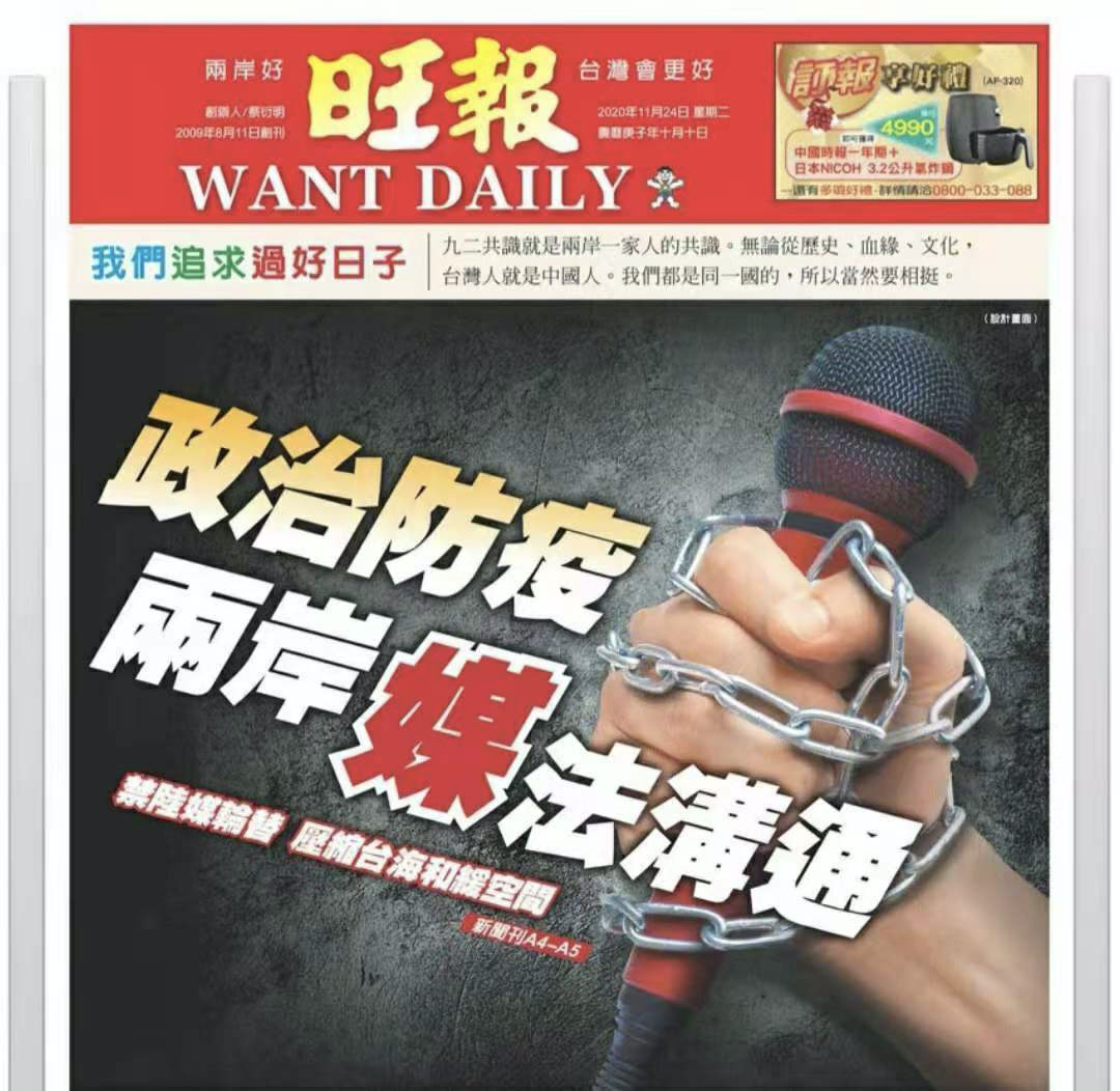 “政治防疫,兩岸媒法溝通”,24日,臺灣《旺報》在封面刊登以此為題的一組文章,批評蔡英文當(dāng)局以防疫為借口,暗地里給大陸駐臺媒體穿小鞋,有可能導(dǎo)致明年過年后形成大陸媒體駐臺記者“自然清退”的局面。《旺報》批評蔡英文當(dāng)局此舉是“政治防疫仇中,毀兩岸安全閥”,該報還質(zhì)問,如果大陸也逼臺媒撤點(diǎn),“誰來為臺灣發(fā)聲?”