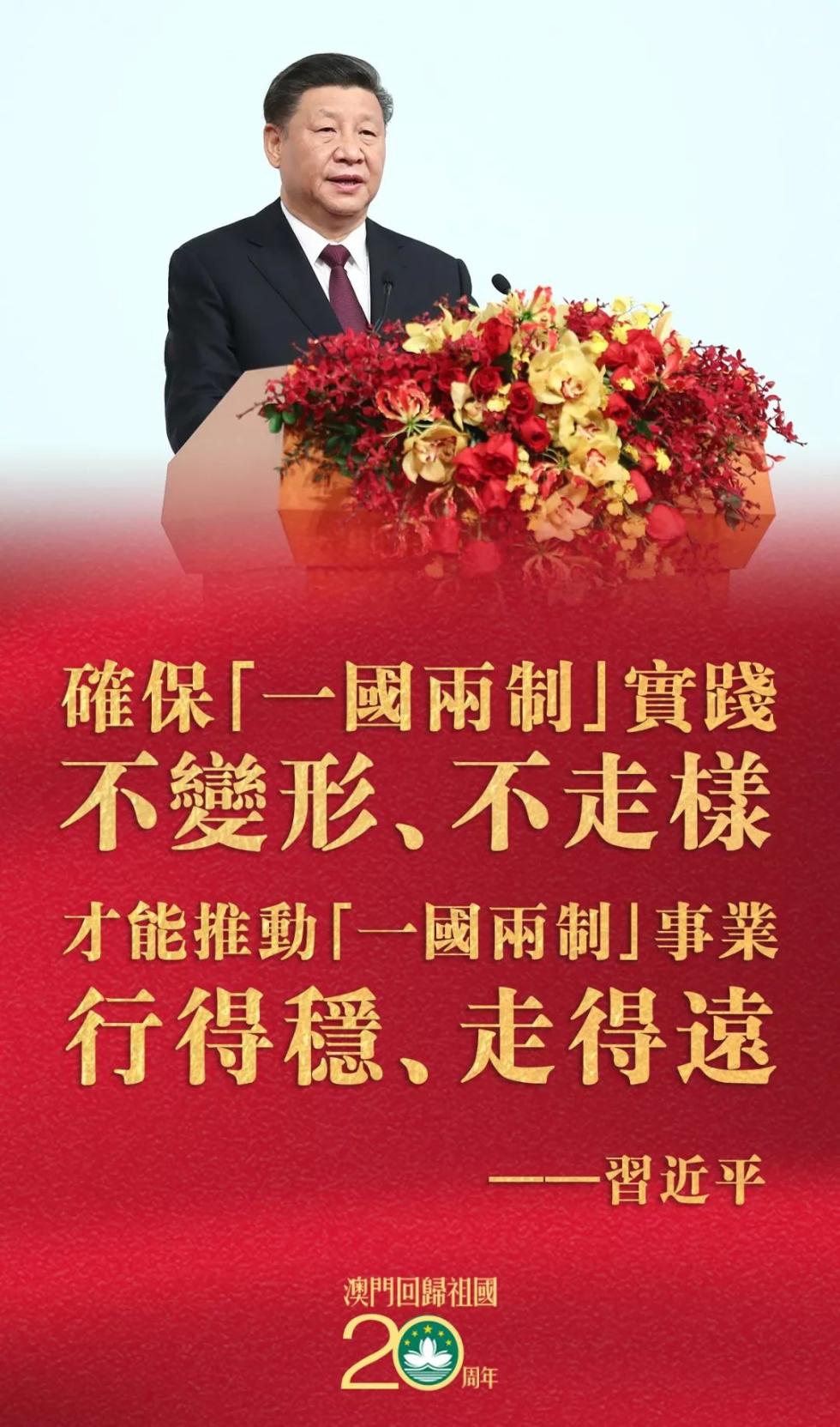 在澳門回歸祖國20周年之際,習(xí)近平主席又一次來到這片蓮花寶地。48小時,19場重要活動,可謂行程緊湊、意義重大。但無論是歡迎晚宴上的致辭,還是會見特區(qū)管治團(tuán)隊、視察解放軍駐澳門部隊時的講話,“一國兩制”始終是習(xí)近平主席不斷提及并多次闡述的關(guān)鍵詞。