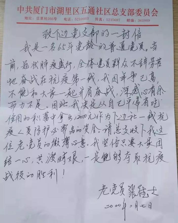 近日,五通社區(qū)下邊支部收到了一封特殊來信,有著65年黨齡的張德士委托兒子將手寫信和12000元送來,用于為社區(qū)一線抗疫人員購買防護品。
