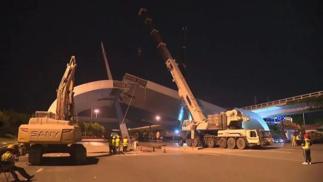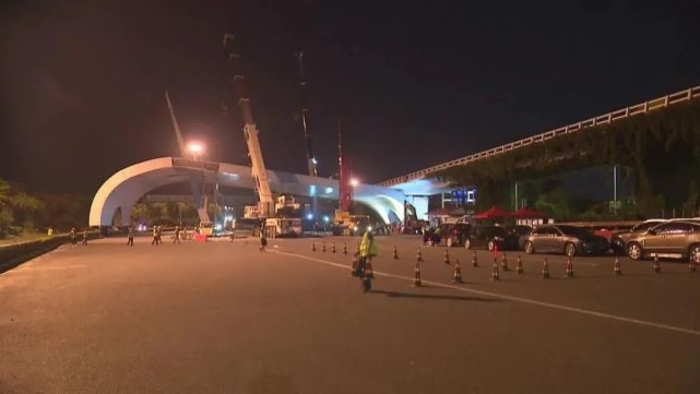 由于頂棚跨度很大,整體重量重,單臺吊車無法獨立起落,我們分成三塊,旁邊還有一塊17米的要7月6日才能拆除,主線會開放三個車道出來,不會影響主線的交通。