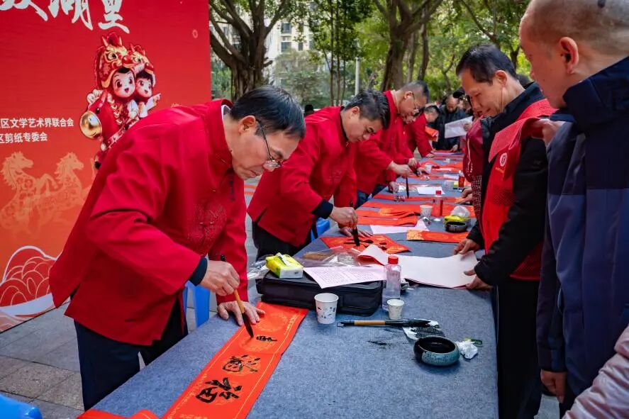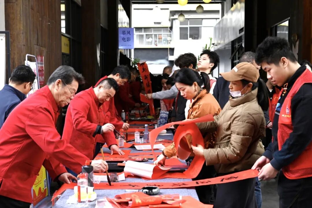 在金山街道金安社區(qū)的活動現(xiàn)場,十幾位書法家鋪開紅紙、揮毫潑墨,筆鋒游走間,春聯(lián)躍然紙上。