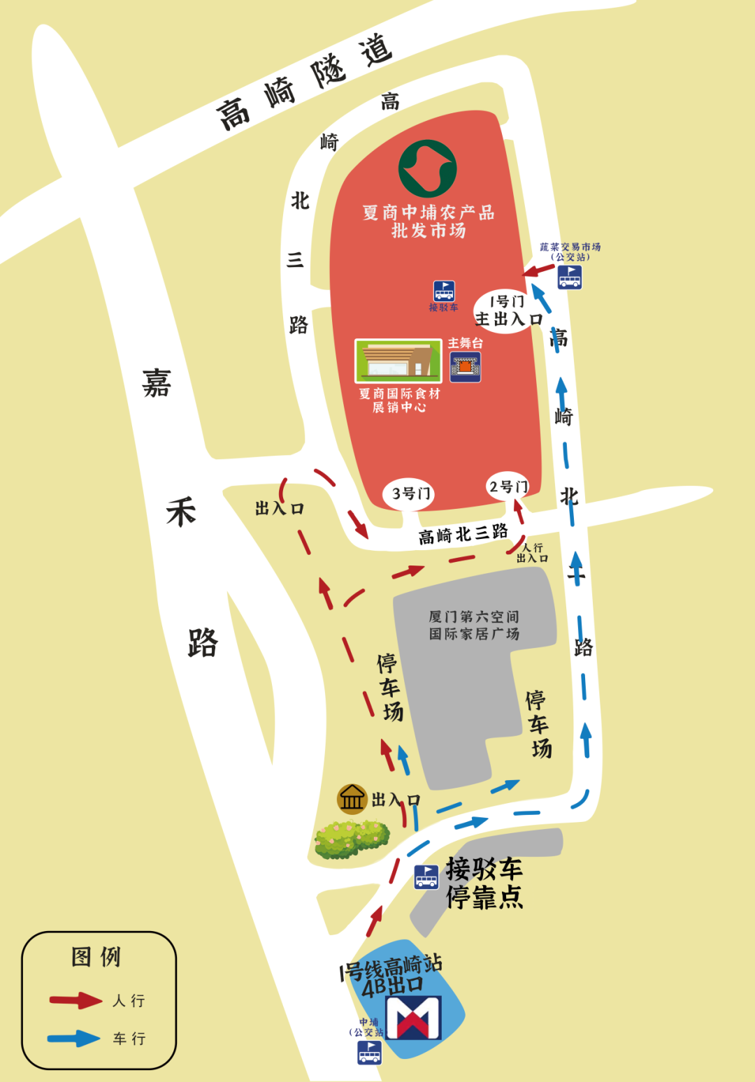 地鐵+接駁:1號線高崎站4B口,“殿小二”免費接駁車往返市場1號門