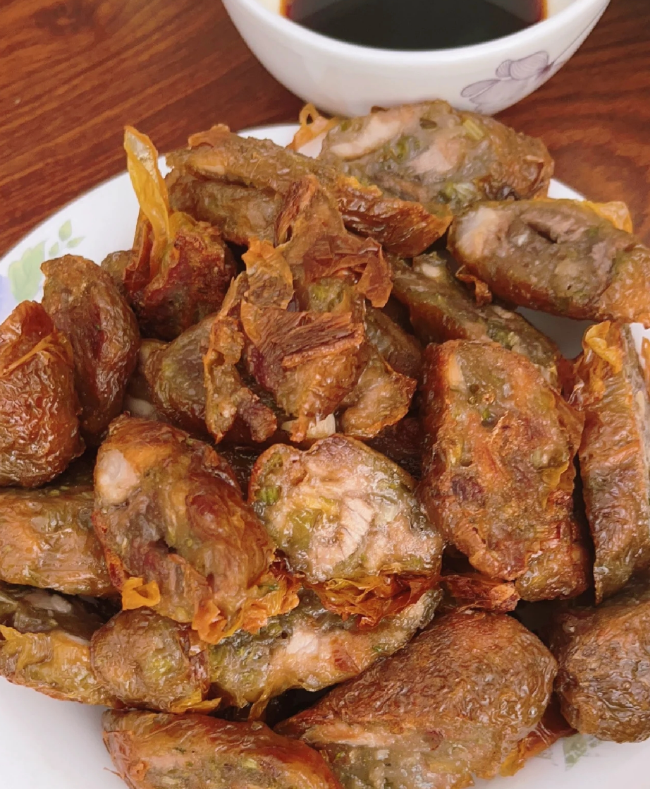 豬肉切成條狀或塊狀,青蔥、荸薺或薺薯等剁成丁,雞蛋打散,將適量的五香粉、白糖、食鹽等混合拌勻,再加上地瓜粉做成內(nèi)料,之后用豆皮包裹成條狀,下油鍋炸至金黃色即可。配上甜辣醬,香嫩酥脆,十分爽口。