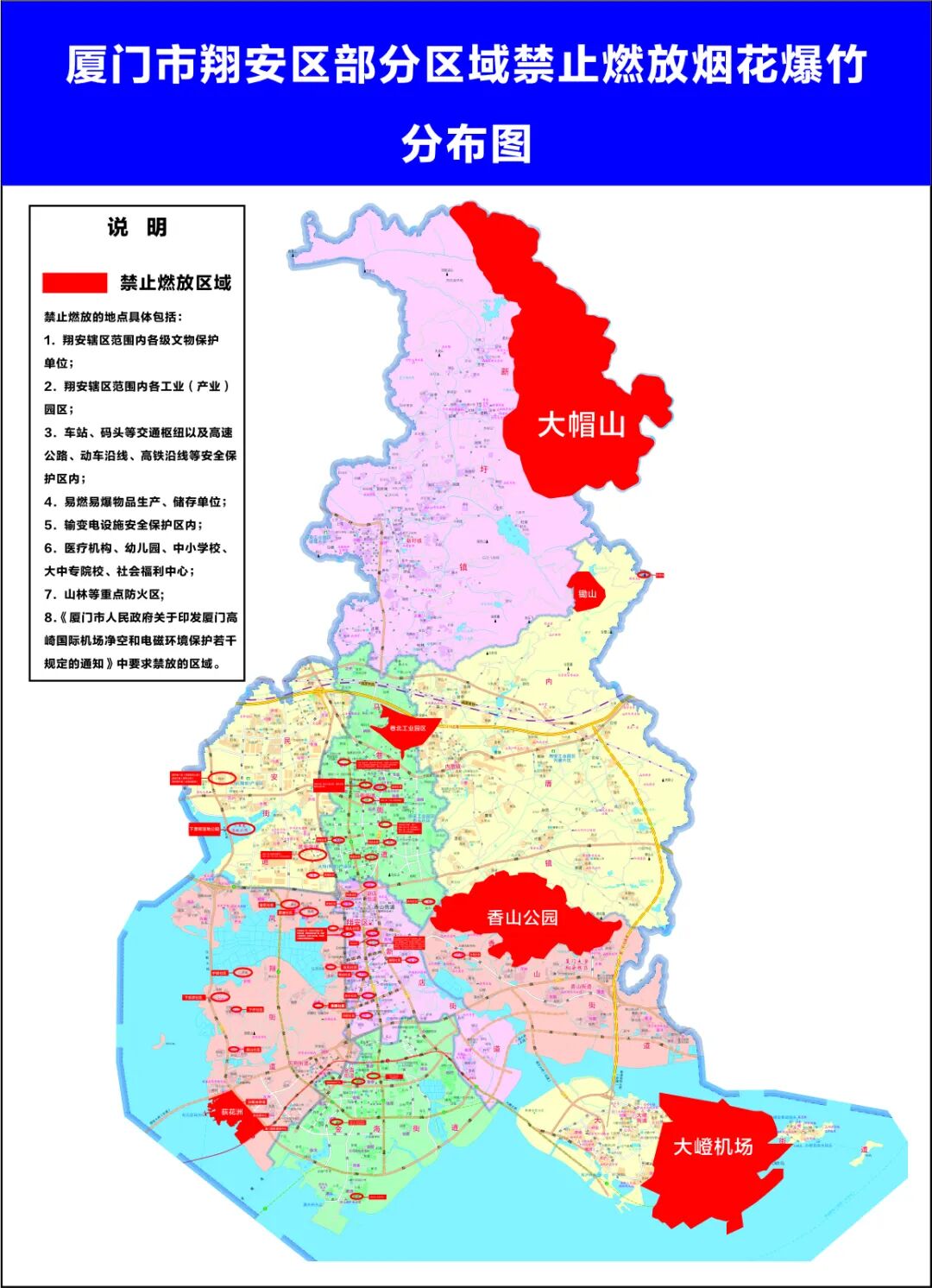禁止燃放區(qū)域:①翔安轄區(qū)范圍內(nèi)各級文物保護(hù)單位;②翔安轄區(qū)范圍內(nèi)各工業(yè)(產(chǎn)業(yè))園區(qū);③車站、碼頭等交通樞紐以及高速公路、動(dòng)車沿線、高鐵沿線等安全保護(hù)區(qū)內(nèi);④易燃易爆物品生產(chǎn)、儲存單位;⑤輸變電設(shè)施安全保護(hù)區(qū)內(nèi);⑥醫(yī)療機(jī)構(gòu)、幼兒園、中小學(xué)校、大中專院校、社會福利中心;⑦山林等重點(diǎn)防火區(qū);⑧成建制的小區(qū);⑨鳳翔街道轄區(qū)的奧體國博荻花洲片區(qū)(北至劉浦路、東北方向至濱海東大道、東南方向至揚(yáng)帆路全部區(qū)域,含片區(qū)內(nèi)海岸線)、閩南新天地等。