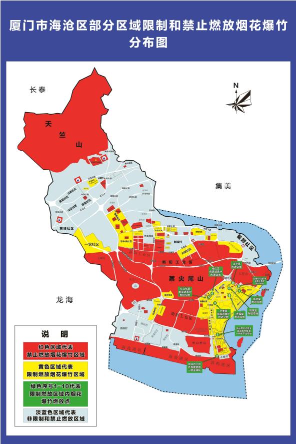 禁止燃放區(qū)域:①海滄區(qū)內(nèi)所有山林防火區(qū)(天竺山、蔡尖尾山、文圃山、龍門山、大屏山、火燒嶼等);②海滄區(qū)內(nèi)所有港區(qū)(建港路、港南路以南至海岸線所有港區(qū));③新陽工業(yè)區(qū)(翁角路以南區(qū)域);④南部工業(yè)區(qū)、出口加工區(qū)(興港路以西、海新路以東、馬青路以南、角嵩路以北區(qū)域);⑤其他特定區(qū)域。