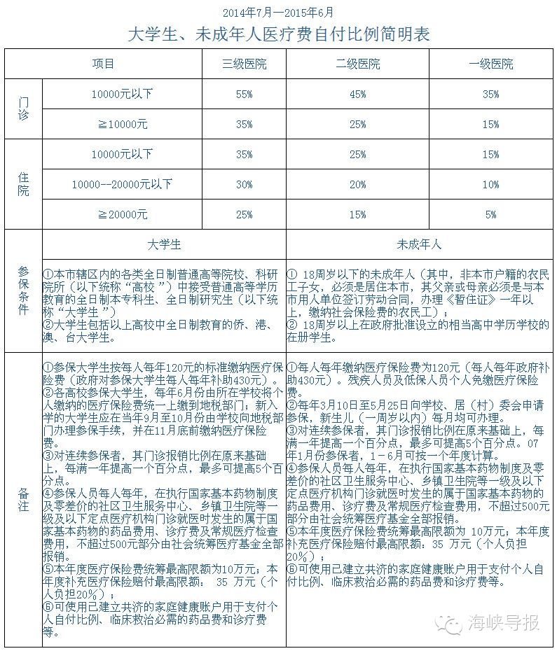 2014年度大學生、未成年人醫(yī)療費自付比例簡明表: