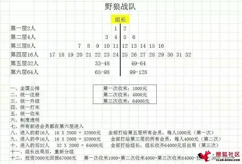 新人入會(huì),每人都要向群主交2000元。升到第二級(jí),每人能獲1000元;升到第四級(jí),每人能獲4000元;群主,也是就是終級(jí)“頭狼”,能獲6.4萬(wàn)元,其它級(jí)別的人沒(méi)錢(qián)可拿。