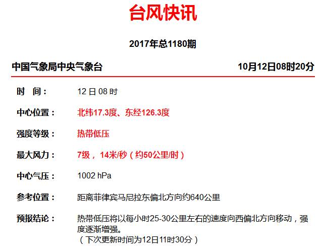 大風預報:12日14時到13日14時,受冷空氣和熱帶低壓共同影響,臺灣以東洋面、巴士海峽、南海中北部偏東海域、臺灣海峽、東海西南部海域,以及臺灣南部和西部沿海、廣東東北部沿海、福建沿海、浙江南部沿海將有7-8級大風,其中臺灣海峽局部海域的風可達9級、陣風10級。