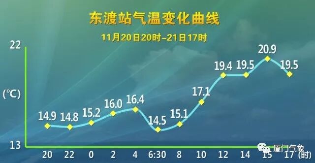 鷺影 藍(lán)天 攝于蓮花公園 臺海網(wǎng)11月22日訊 據(jù)廈門晚報(bào)報(bào)道 昨天,我市天氣陰晴不定,上午在雨水的打壓下,氣溫迅速下挫,東渡站一度降到14.5℃。隨著降雨逐漸停歇,昨天午后陽光短暫露臉,氣溫也開始明顯上升,東渡站最高升到了20.9℃,是這幾天以來最暖和的時候。 今天夜...