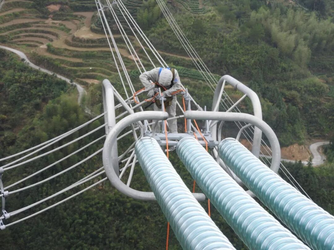 在距離導(dǎo)線均壓環(huán)還有0.6米距離時,我的右手電位轉(zhuǎn)移棒與高壓線之間產(chǎn)生了一道耀眼的電弧。沒有一刻遲疑,我迅速用轉(zhuǎn)移棒抓牢了導(dǎo)線,成功進入了等電位。