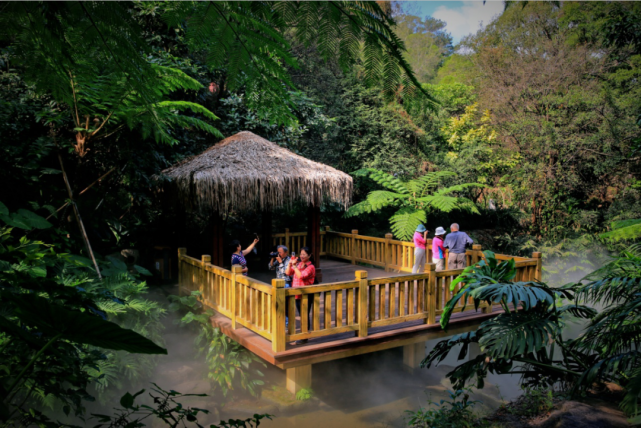當(dāng)你走到雨林世界,一絲涼意迎面撲來(lái)。每當(dāng)霧森系統(tǒng)打開(kāi)時(shí),水霧繚繞在整個(gè)景區(qū),宛如一片仙境。高大的植物制造出了大片陰影,陽(yáng)光從枝葉的縫隙中射入,光影斑駁,如詩(shī)如畫(huà)。