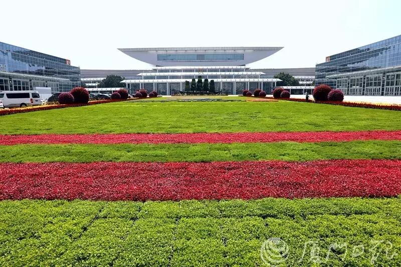 ▲廈門國(guó)際會(huì)展中心,鮮艷的花球、精心設(shè)計(jì)的綠雕營(yíng)造出喜慶的氛圍。